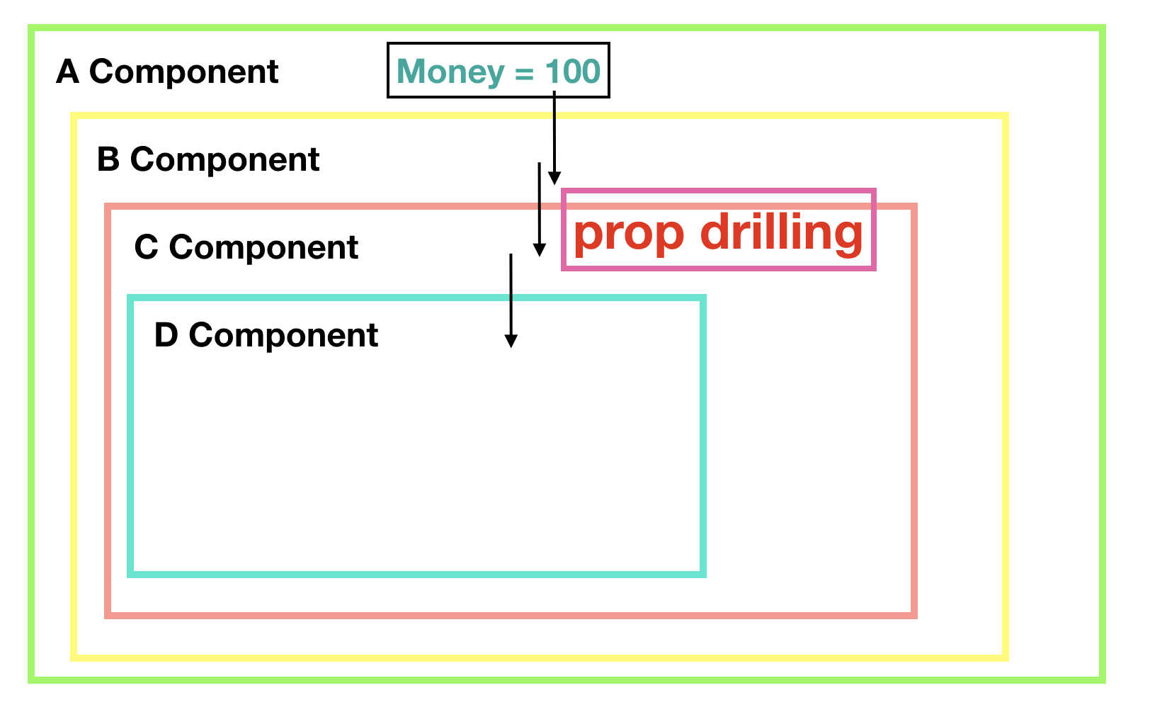 위 그림 처럼 A라는 컴포넌트에 monet르 d에게 전달하기 위해서는 A -> B - C -> D로 전달해야한다.
